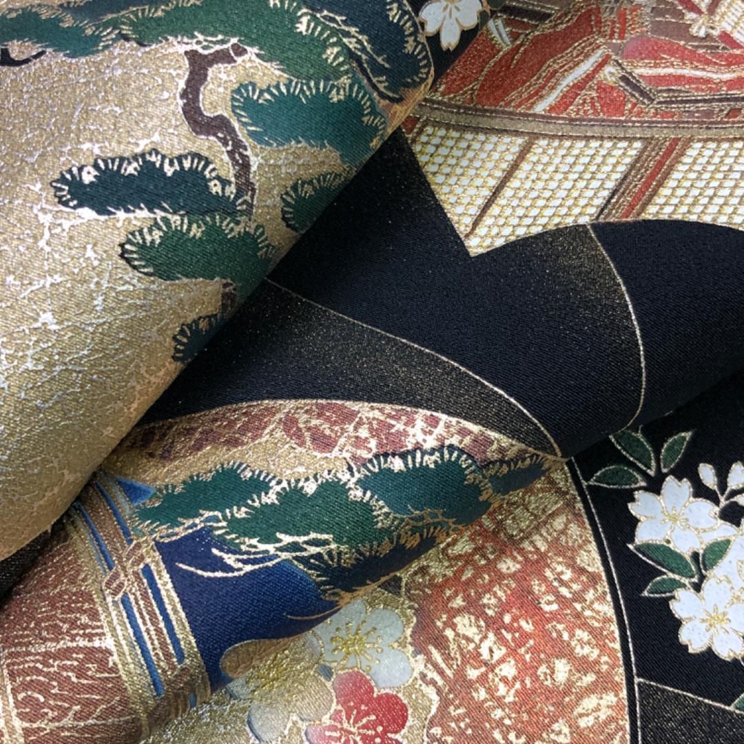 黒留袖 作家物 洛中洛外図 地紙に花模様 桜 女性と男性 金彩 K-5334の検索結果