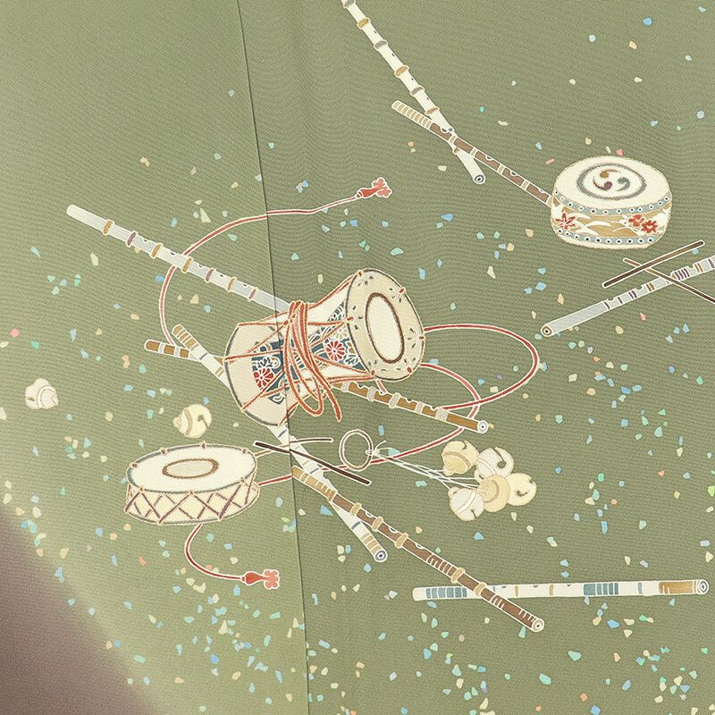 カーキ色と、灰水色の色分けの訪問着です。小さな散らしのような柄で、柄の流れを感じさせます。流れるように、鼓や笛、鈴などの楽器の柄が表現されております。裾は、グレーみのある薄茶、薄灰緑、下前身頃から覗く水色…シックな色の色分けで、おしゃれ感が強いです。楽器柄なので、観劇や演奏会など、意味を込めての着こなしもおすすめですね。色々な遊び心のあるおしゃれ感のあるフォーマルは、一枚あると、楽しくなるお着物です。
