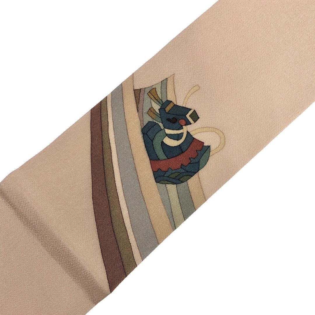 尾花色のお色味の縮緬地に郷土玩具、馬の玩具がデザインされた雰囲気の良い染柄の素敵なお品でございます。