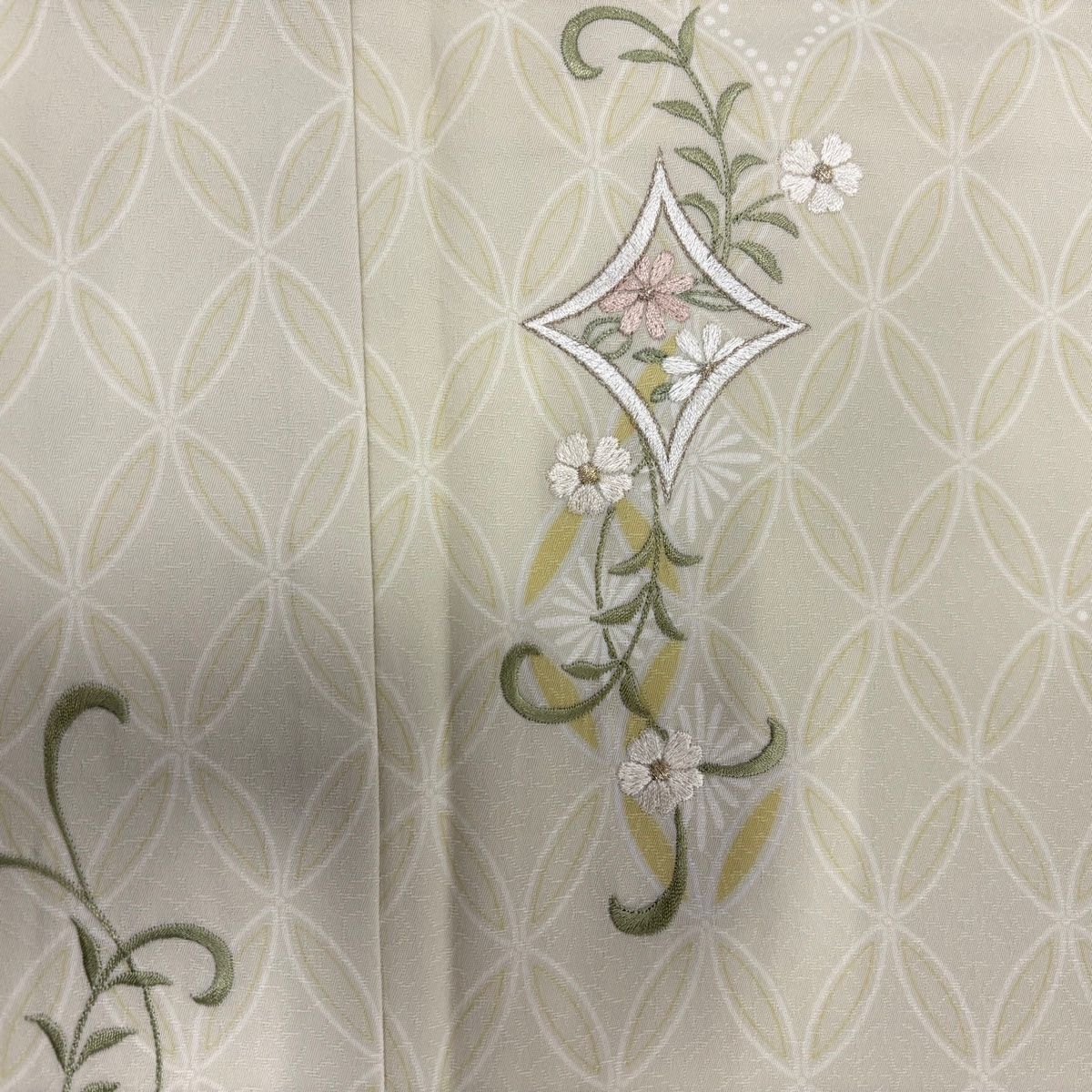 付下げ 身丈169cm 裄丈66.5cm M 袷 洗える着物 草花 七宝 金糸 刺繍 灰緑 化繊 秀品の検索結果