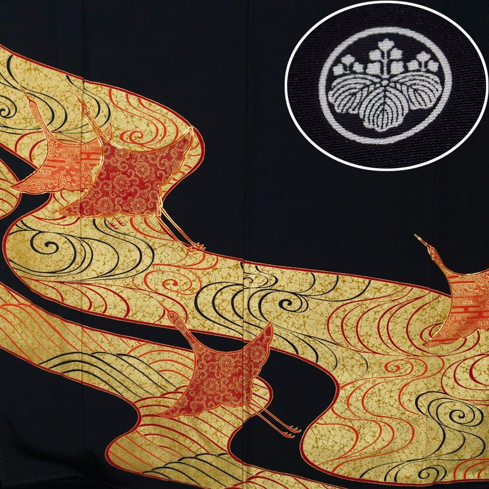 着物セット 黒留袖 袋帯 長襦袢 3点 セット 道長に飛鶴 流水模様 丸に五三の桐紋 五つ紋入り Lサイズ 刺繍 金箔 黒留袖 リサイクル着物 黒留袖 黒とめそで 黒留め袖 留め袖 結婚式 留袖 販売 GLOBALQUALITYIMPORTS_COM