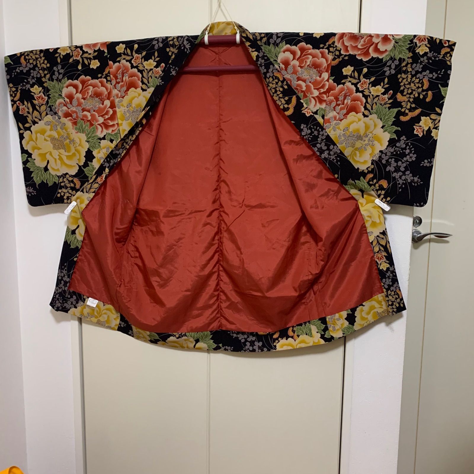 京やM454 洗える道中着コート 着物コート 和装コート 洗える素材 袷仕立て 着物衿仕立て 裄長め ブラック 黒 裄長め セミフォーマル カジュアル用 3シーズン対応 袷 単衣兼用コート 仕立て上がり 道行 道中着 羽織 塵除け 風除け リサイクル着物