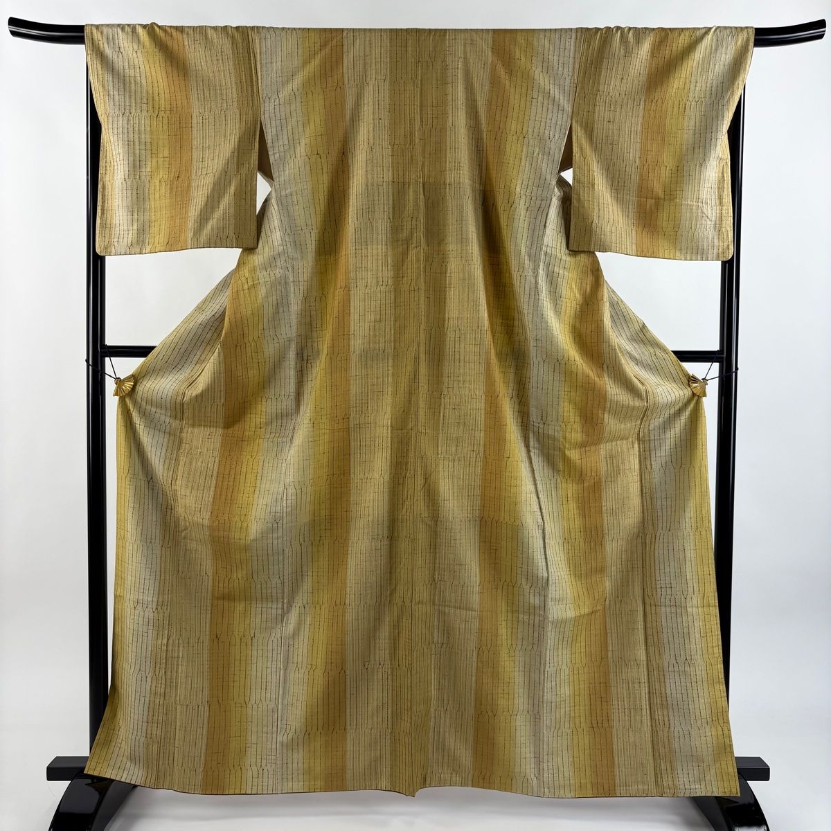 小紋 身丈164cm 裄丈68cm L 袷 名古屋帯セット 紬地 縞 幾何学模様 絞り からし色 正絹 秀品 GLOBALQUALITYIMPORTS_COM