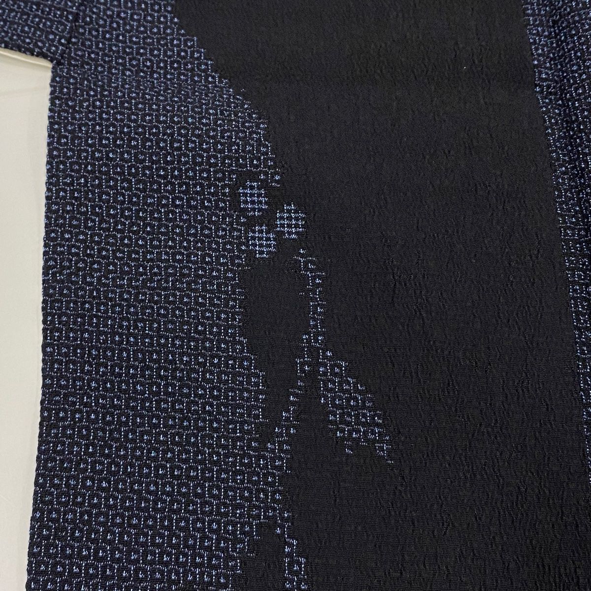お召 身丈155.5cm 裄丈62.5cm S 薄物 雪の中のきれ やまだ織 証紙 幾何学模様 藍色 正絹