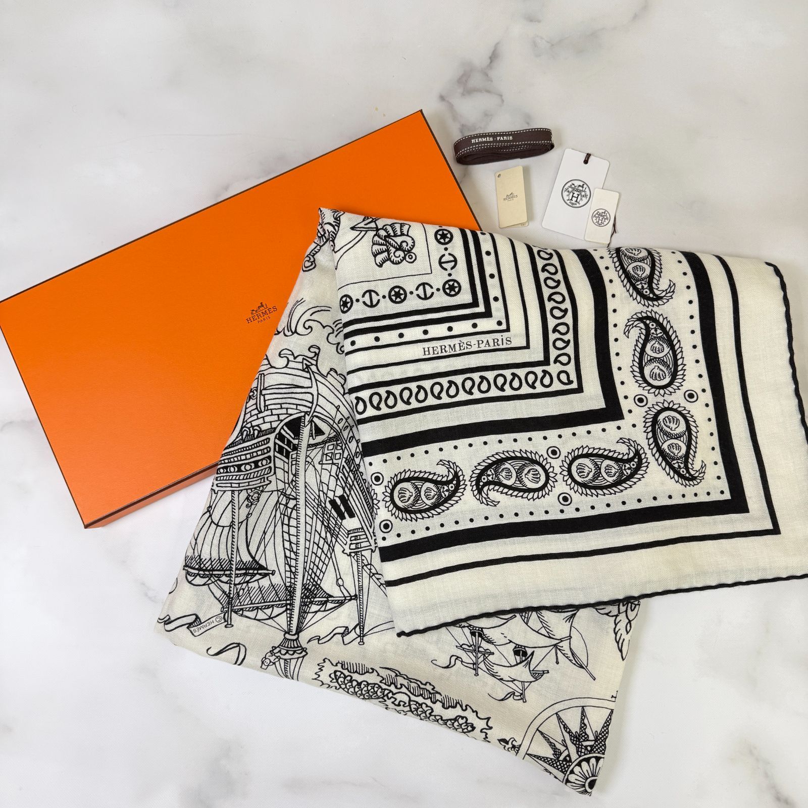 鑑定済み エルメス カレジェアン 140 船乗りのタトゥー バンダナ 白 黒 カシシル スカーフの検索結果