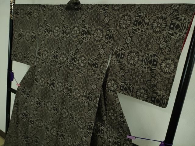 大島紬 身丈167.5cm 裄丈67cm M 袷 純泥染 証紙 椿 市松 茶色 正絹 秀品