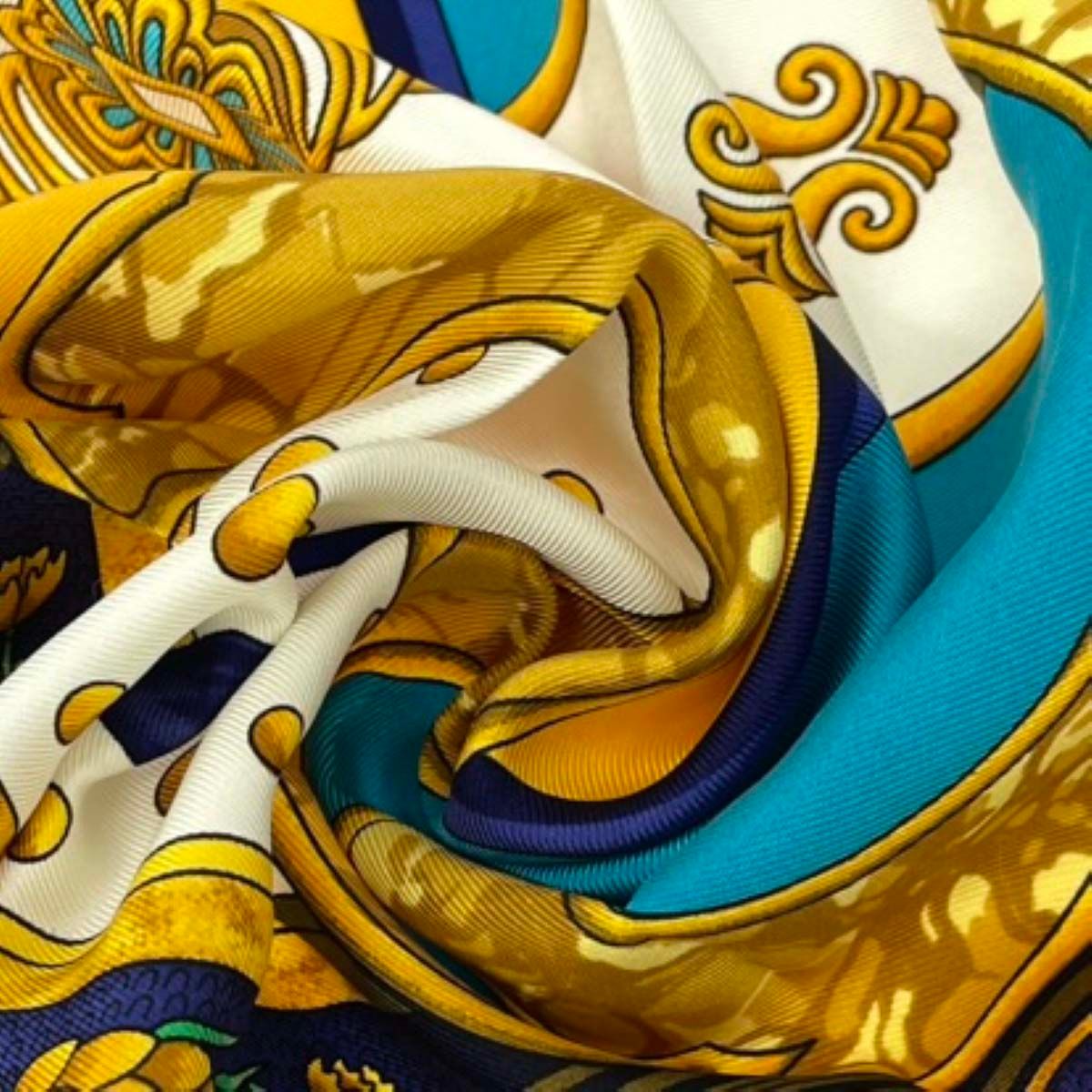HERMES スカーフ カレ90 LVDOVICVS MAGNVS 白い馬に跨ったルイ14世 シルク ブルー 管理番号 10240