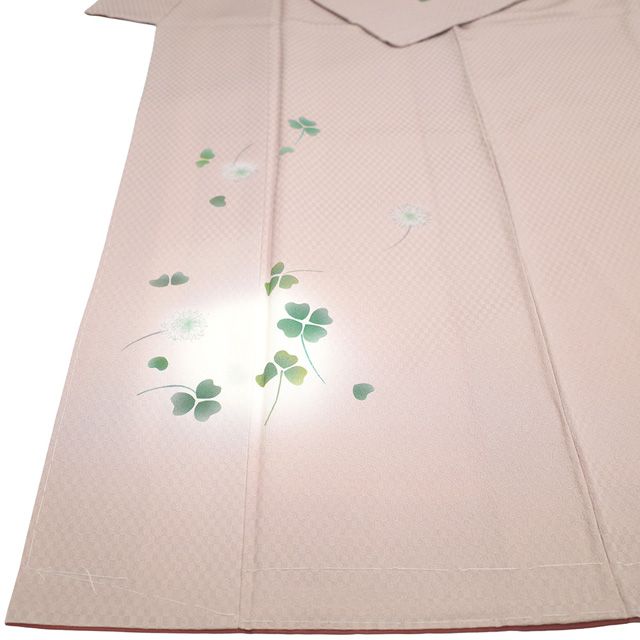 新古品 付下げ 着物 正絹 袷 落款有り 手染め ローズダスト色 クローバー 綿毛 地紋 市松 おしゃれ 春 秋 冬 付け下げ 着物 くすみピンク 仕立て上がり 身丈165 裄丈69.5 Lサイズ みやがわ sb16373 GLOBALQUALITYIMPORTS_COM