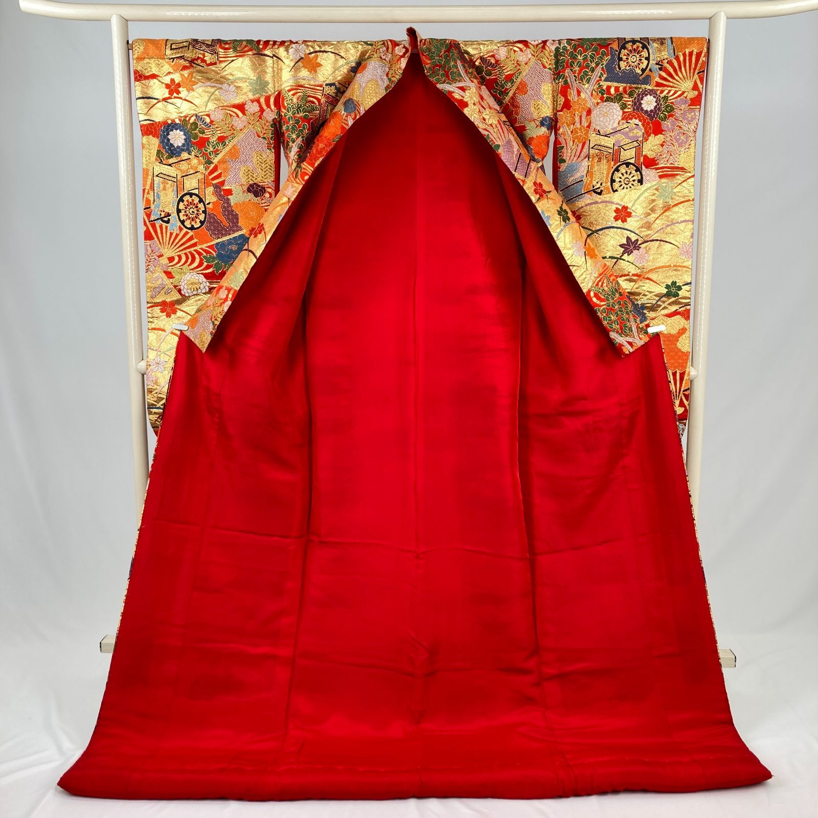 たんす屋 着物 リユース打掛 色打掛 赤 金 フォーマル 扇に御所車 袷 ポリエステル 未洗い 身丈 188cm 裄丈 68cm MS5890 GLOBALQUALITYIMPORTS_COM
