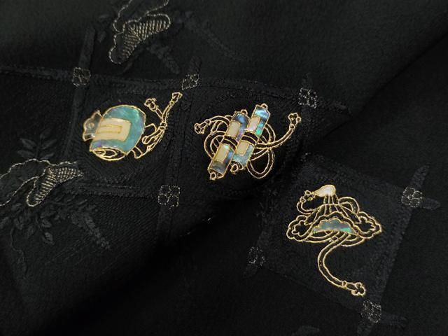 黒留袖 五つ紋 比翼付き 金糸 玉手箱 菊 牡丹 橘 扇 着物 094b d