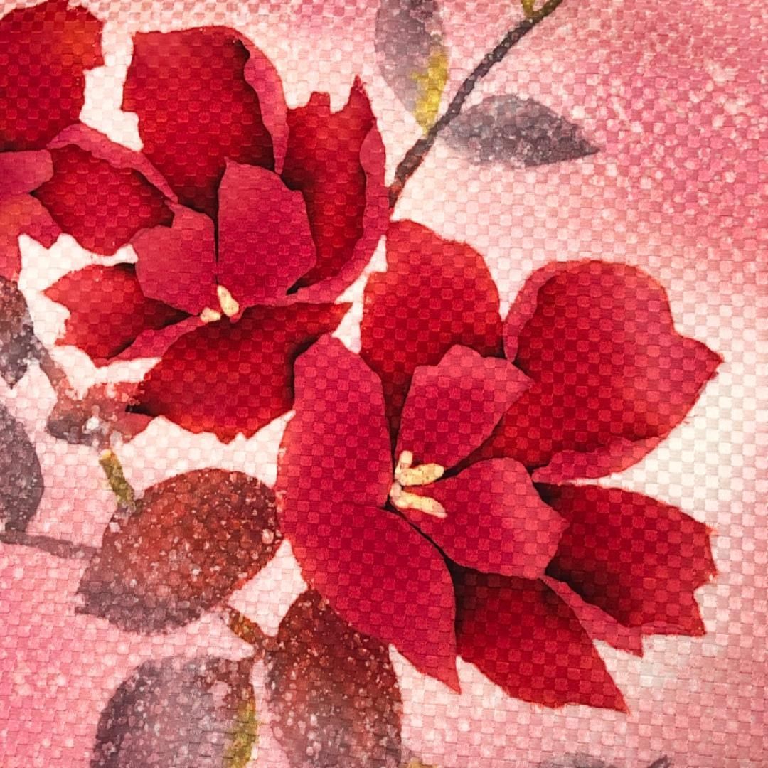 薄紅梅色ベースのお色味に赤く鮮やかな花模様の柄裄がデザインされた素敵なお品でございます。