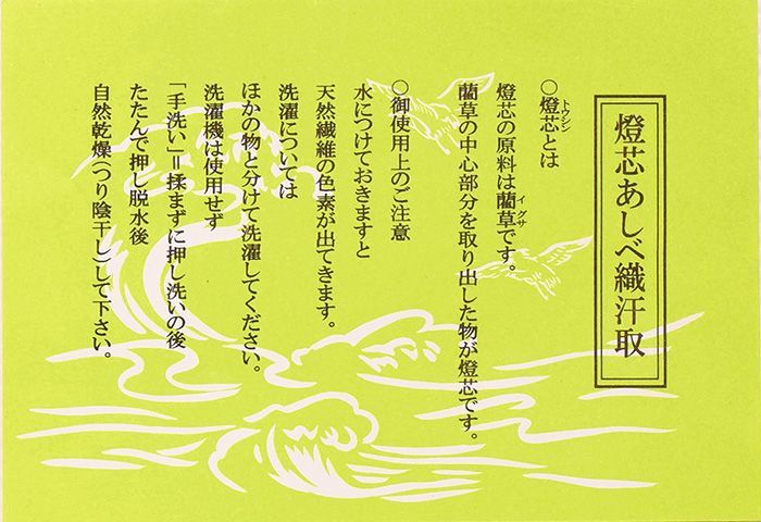 吸湿性に優れた天然素材【燈芯】を使用し、二重の織布によって縫製されているので、大抵の汗かきの方でもこの肌襦袢によって充分に吸汗の効果が得られます。