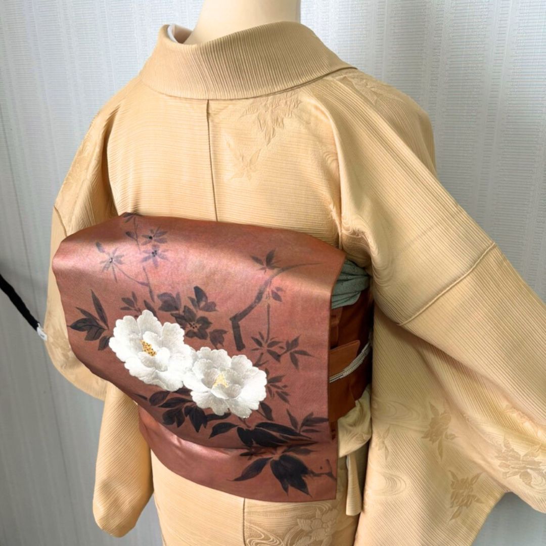 色無地 着物 名古屋帯 帯揚げ 帯締め 4点セット 正絹 ベージュ 無地紋なし 植物地紋 身丈156cm 裄63.5cm 帯354cm 上品 コーディネートセット 秋冬 お茶会 入学式 卒業式 七五三 セミフォーマル カジュアル対応 おしゃれきもの GLOBALQUALITYIMPORTS_COM