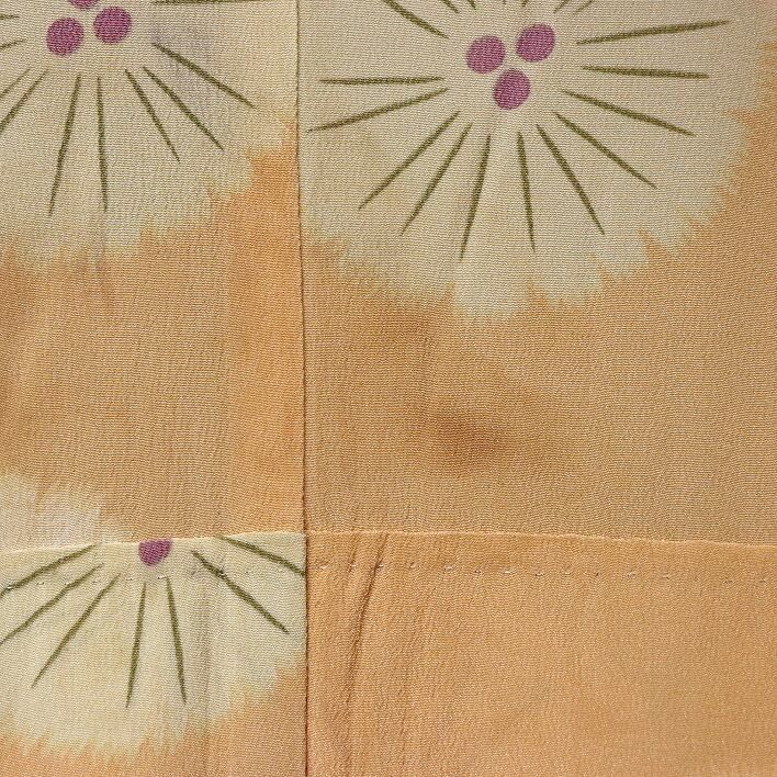 裄丈:約62cm、袖丈:約45cm、身丈:約116cm、うら背中しみあり、紐しみあり、襟汚れ、絹製。状態ランク:D