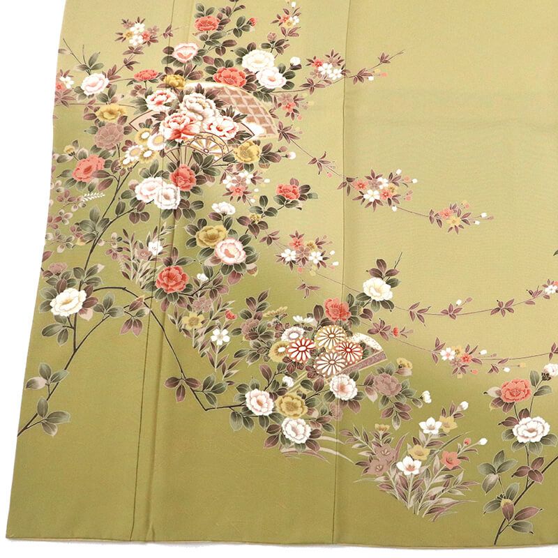 訪問着 袷 レディース 正絹 黄ベージュ 花柄 身丈164.5cm 裄丈65cm 式典 入学式 卒業式 七五三 Mサイズ相当 GLOBALQUALITYIMPORTS_COM