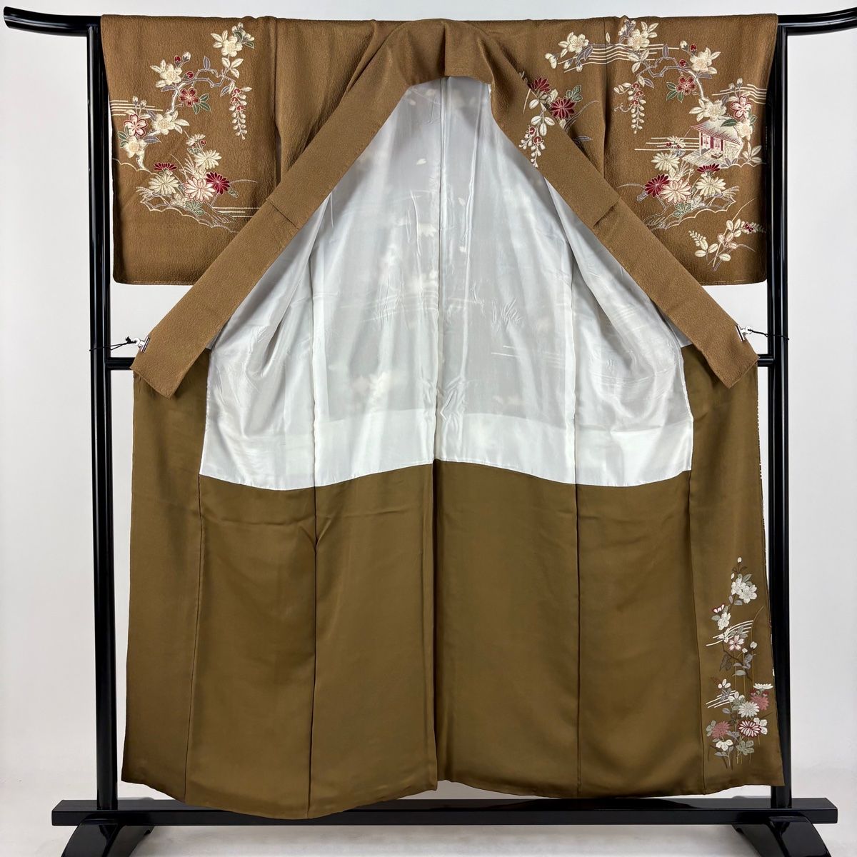 訪問着 身丈164cm 裄丈66cm M 袷 華文 花唐草 銀糸 刺繍 茶緑色 正絹 秀品 一つ紋