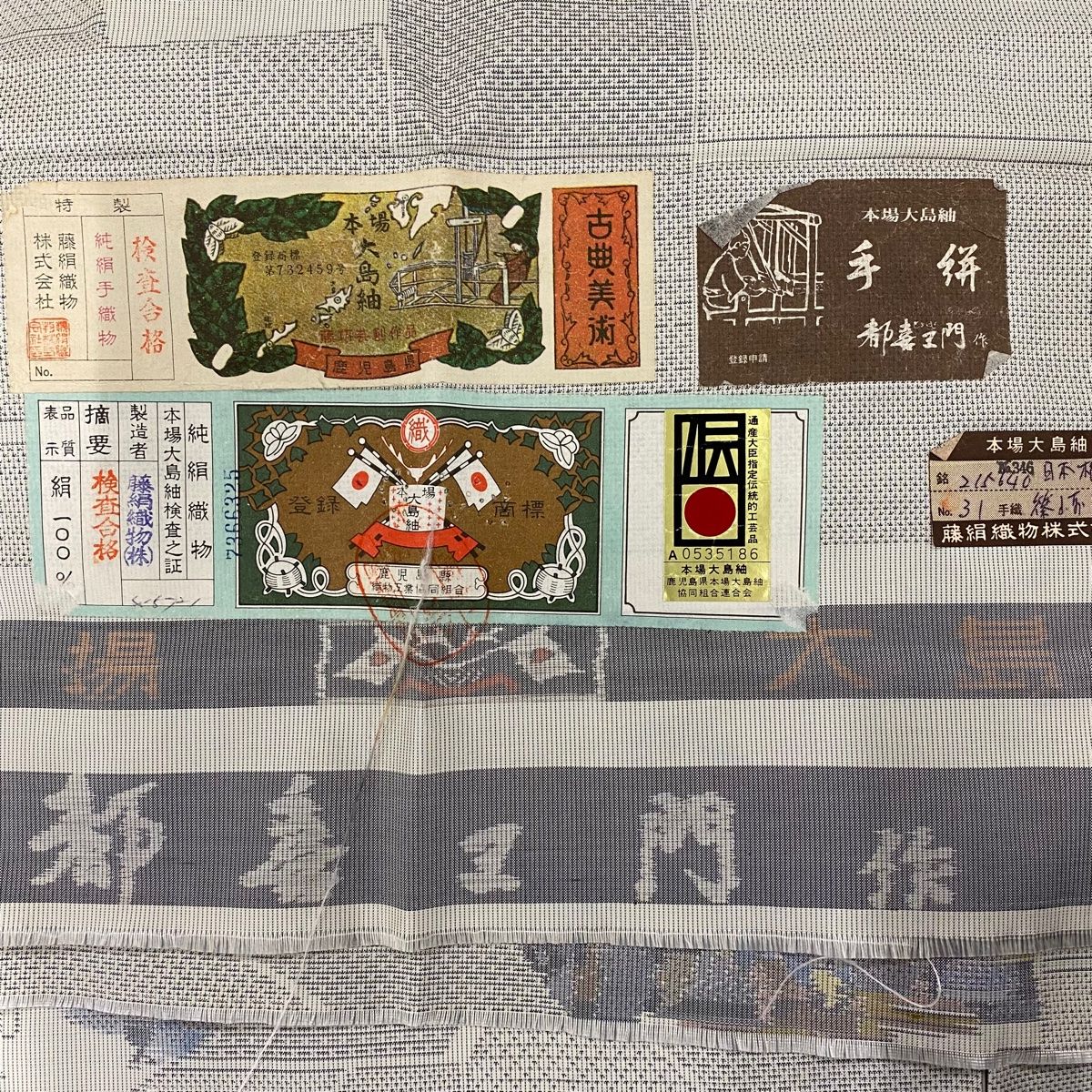 大島紬 身丈157.5cm 裄丈63.5cm S 袷 都喜ヱ門 証紙 扇面 幾何学 灰色 正絹 GLOBALQUALITYIMPORTS_COM