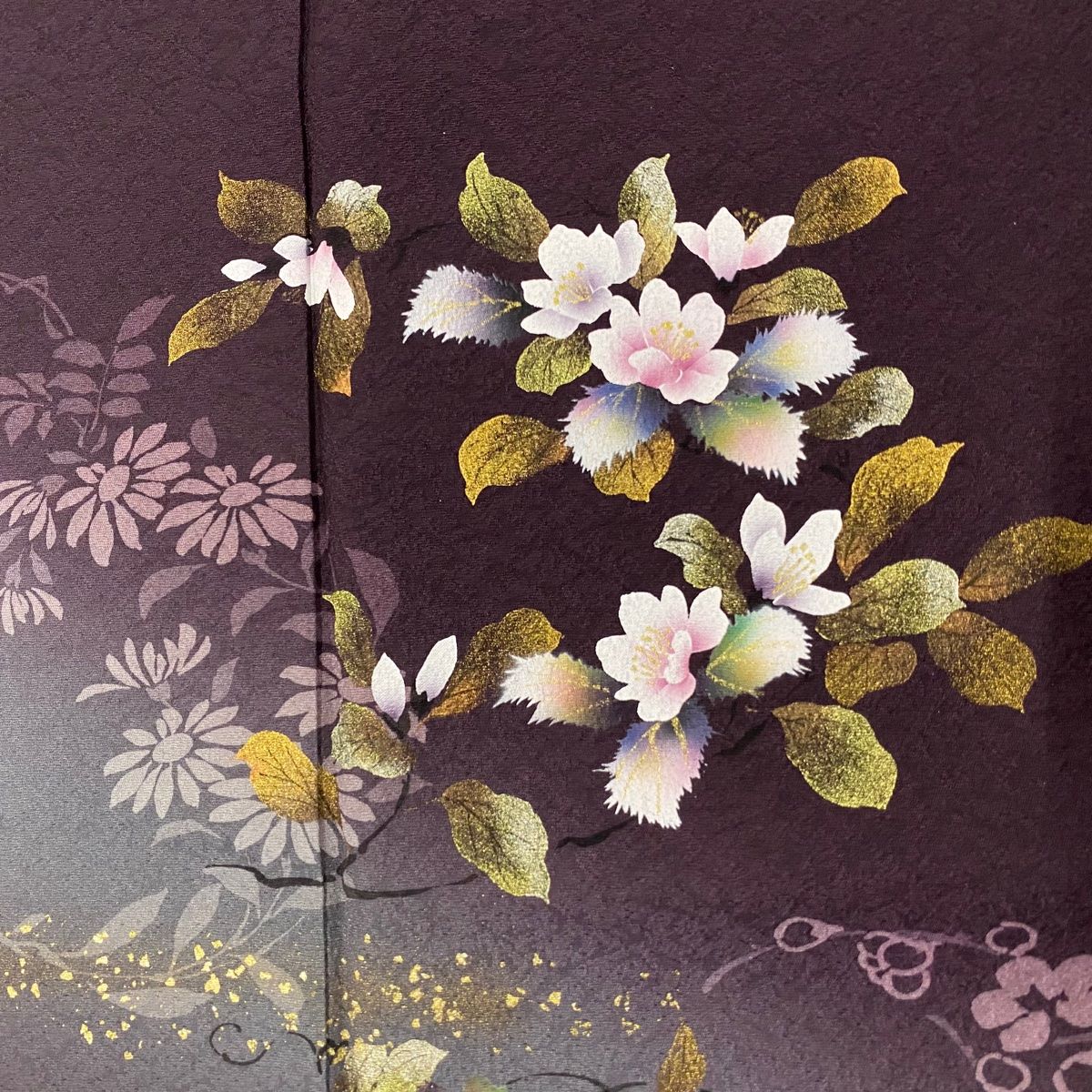 付下げ 身丈162cm 裄丈66cm M 袷 やまと 落款 草花 花丸文 金銀彩 ぼかし 濃紫 正絹 秀品の検索結果
