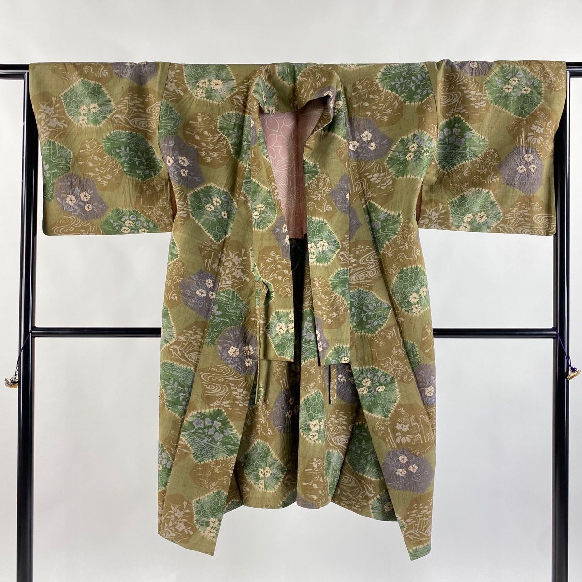 道中着 身丈111cm 裄丈66cm M 和装コート 着物衿 紬地 秋草 流水 絞り 金彩 茶緑色 正絹の検索結果