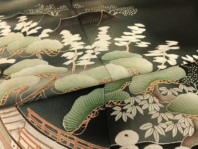 平和屋着物 アンティーク 大正ロマン 黒留袖 風景松文 両褄 暈し染め 金糸 正絹 AABB6466zgの検索結果