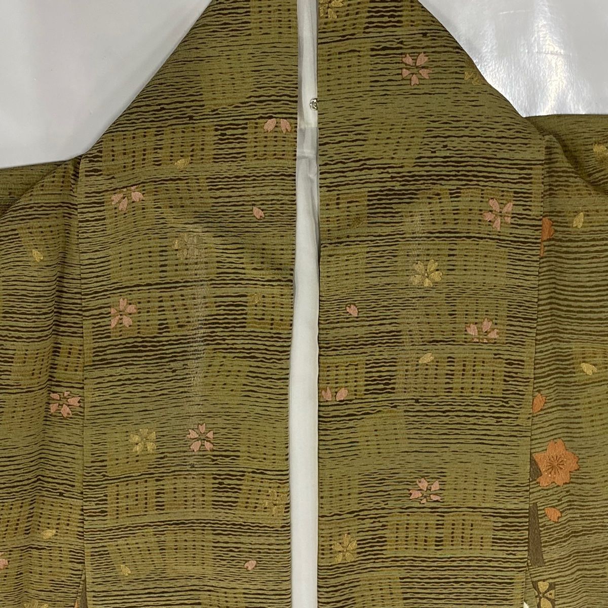 小紋 身丈160cm 裄丈64.5cm M 袷 草花 鶯色 正絹