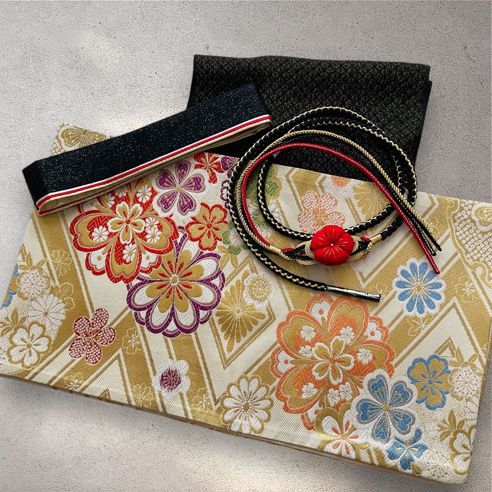 振袖・帯・重ね衿・帯揚げ・帯締め・長襦袢(半衿付き)の6点セットです。