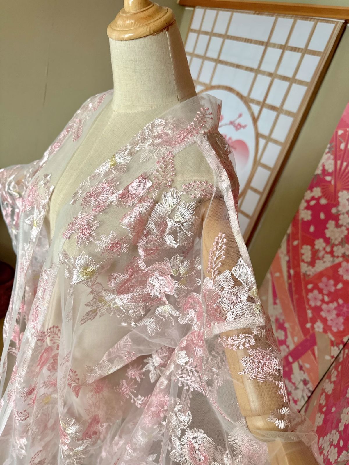 チュール打掛 オーガンジー打掛 着物 オーバードレス レース羽織 ウエディングドレス お色直し 刺繍 色変更 3D立体的な刺繍 うす衣 和装 和装花嫁 和装前撮り 色打掛 大人婚 舞台ステージ 時代劇用演劇 芝居 芸者 浴衣 ピンク GLOBALQUALITYIMPORTS_COM
