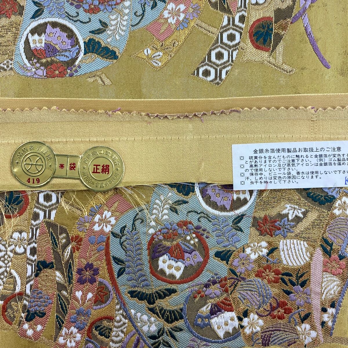 袋帯 秀品 証紙 小槌 花鳥 箔 黄土色 六通 正絹 GLOBALQUALITYIMPORTS_COM
