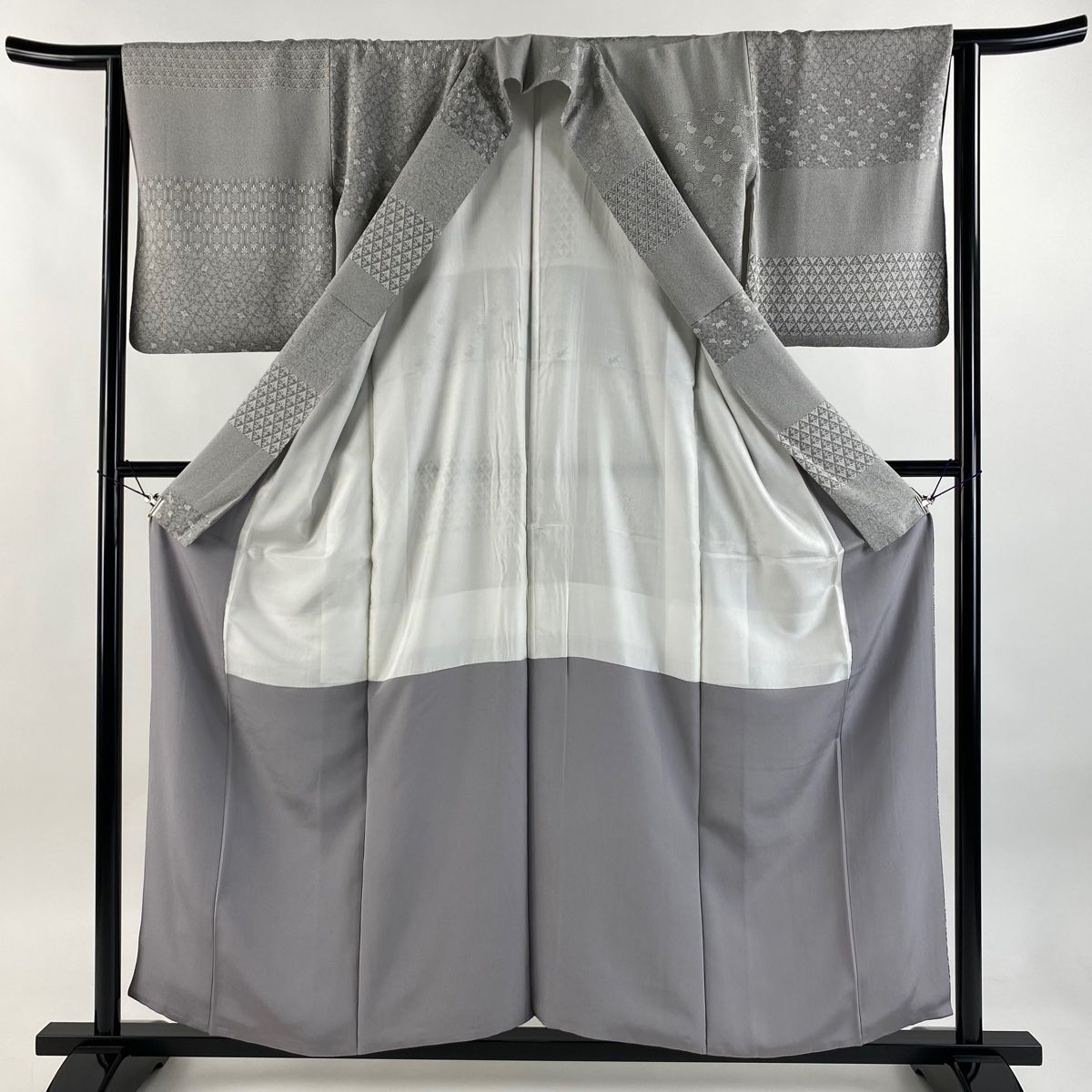 小紋 身丈152cm 裄丈61.5cm S 袷 紋意匠 草花 縦縞 灰色 正絹