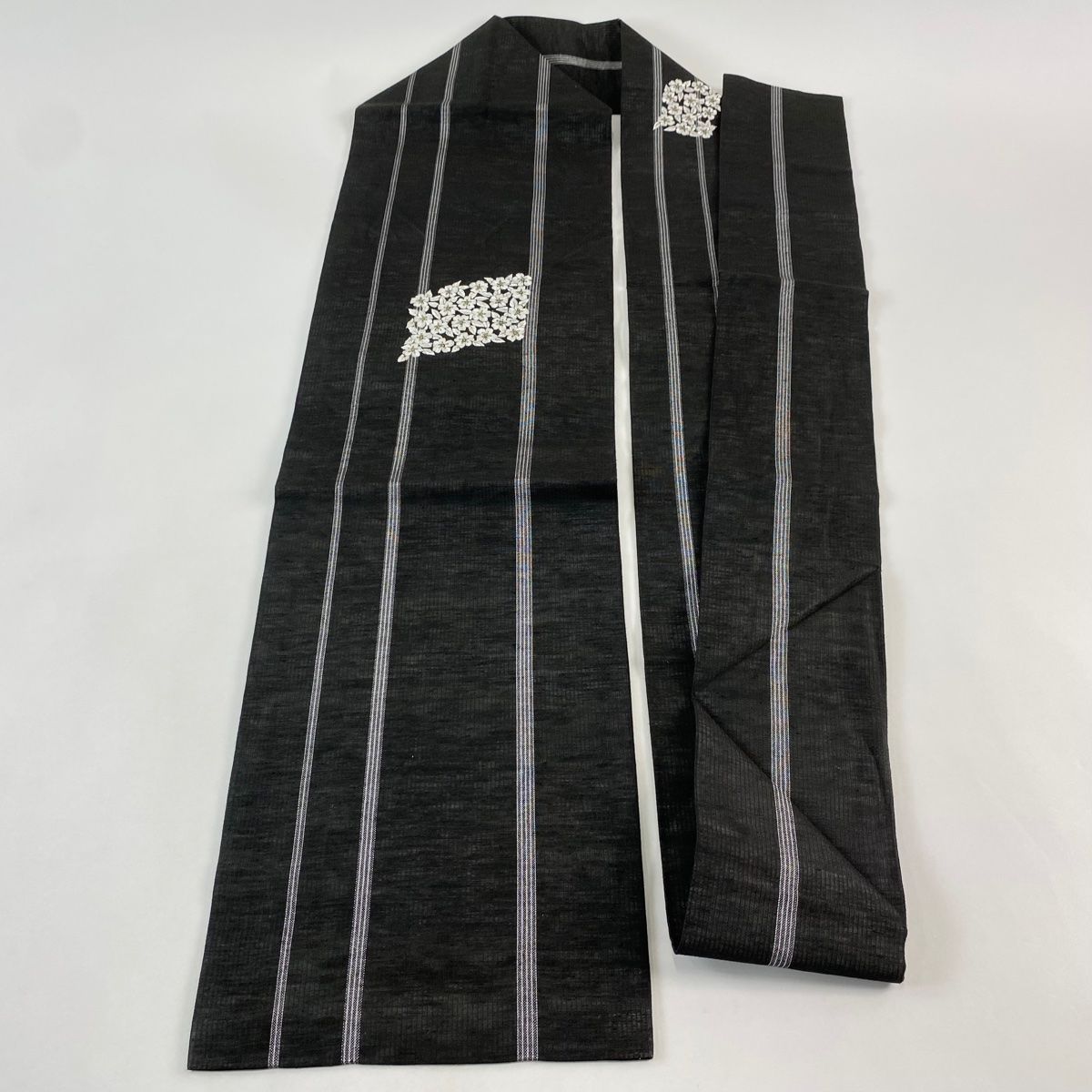 名古屋帯 秀品 夏帯 草花 縞 刺繍 金銀糸 黒灰 正絹 GLOBALQUALITYIMPORTS_COM