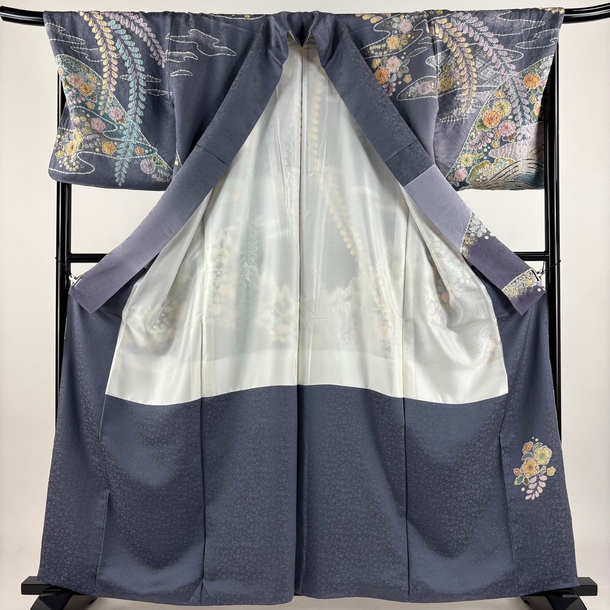 訪問着 身丈162.5cm 裄丈64.5cm M 袷 草花 秋草 金彩 ぼかし 青灰色 正絹 秀品