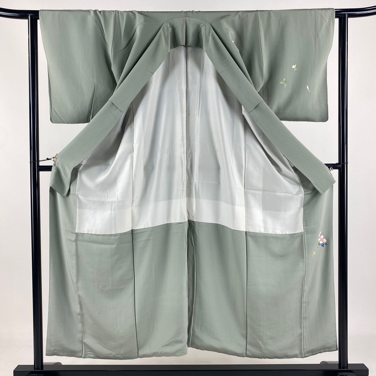 付下げ 身丈169cm 裄丈66.5cm M 袷 洗える着物 草花 七宝 金糸 刺繍 灰緑 化繊 秀品