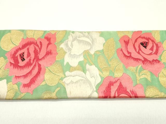 平和屋着物 アンティーク 大正ロマン 九寸名古屋帯 唐織 薔薇 バラ 淡萌葱色 金糸 正絹 DAAW6847obの検索結果