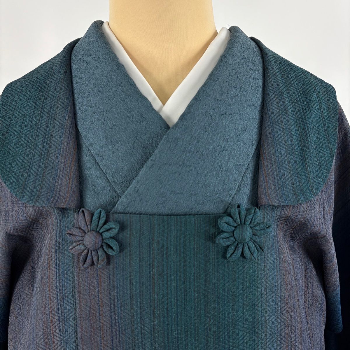 道行 身丈106cm 裄丈68cm L 坂東三津五郎 和装コート 被布衿 やまと 落款 縦縞 地紋 青緑 正絹の検索結果