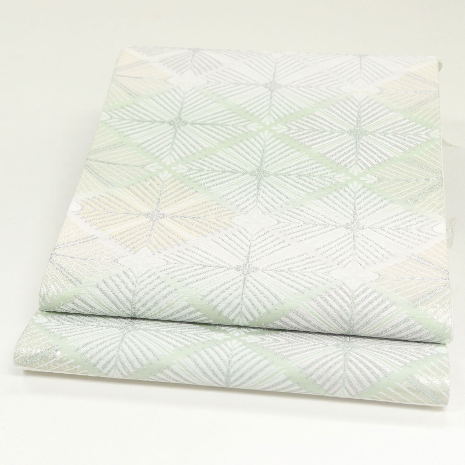 しなやかな帯地は、オフホワイト色、薄緑色のお色目で横段状にぼかすように織り上げられております。