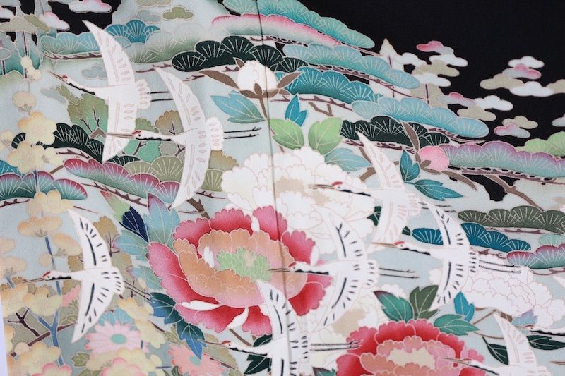 黒留袖 黒 朱 ひわ 緑 桜色 白 鶴 花 波 五つ紋マルニ梅鉢 京友禅 TT34の検索結果