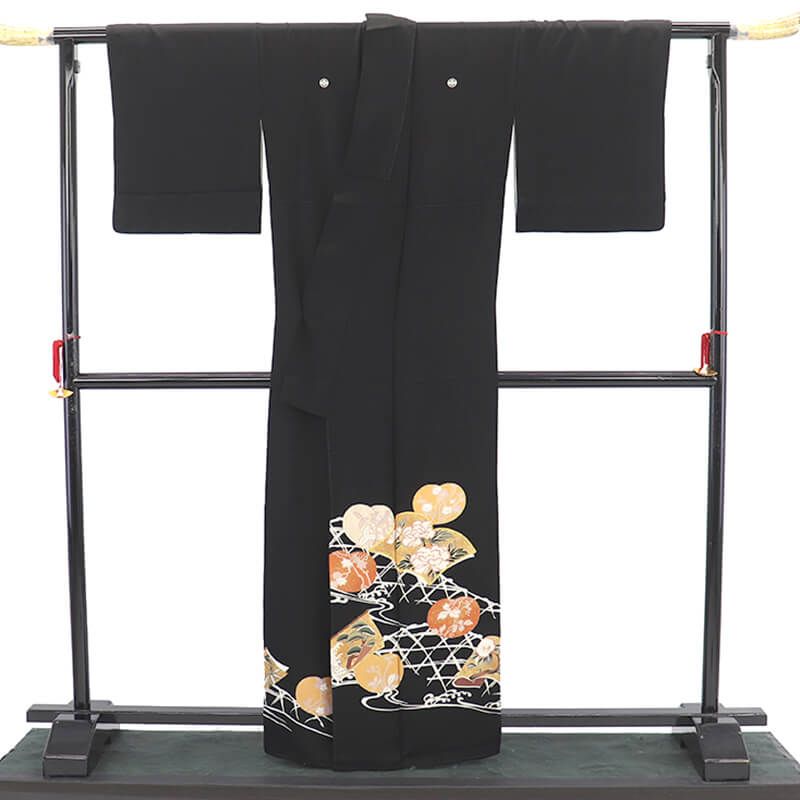 黒留袖 販売 単品 礼装 着物 和装 フォーマル 正絹 黒 丸に横木瓜 冊子文 団扇文 落款 身丈166cm 裄丈66cm 結婚式 母親 M Lサイズ相当 リサイクル着物 リユース着物 着物の検索結果