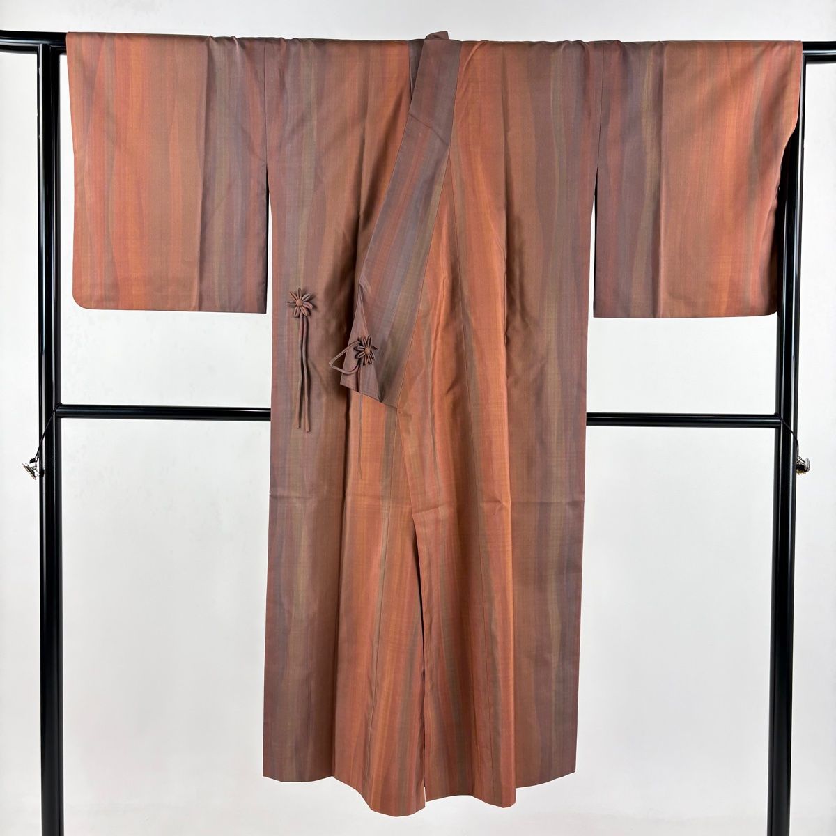 道中着 身丈131.5cm 裄丈67cm M 和装コート 着物衿 リバースブル 大島紬地 落款 証紙 縞 赤茶 正絹 GLOBALQUALITYIMPORTS_COM