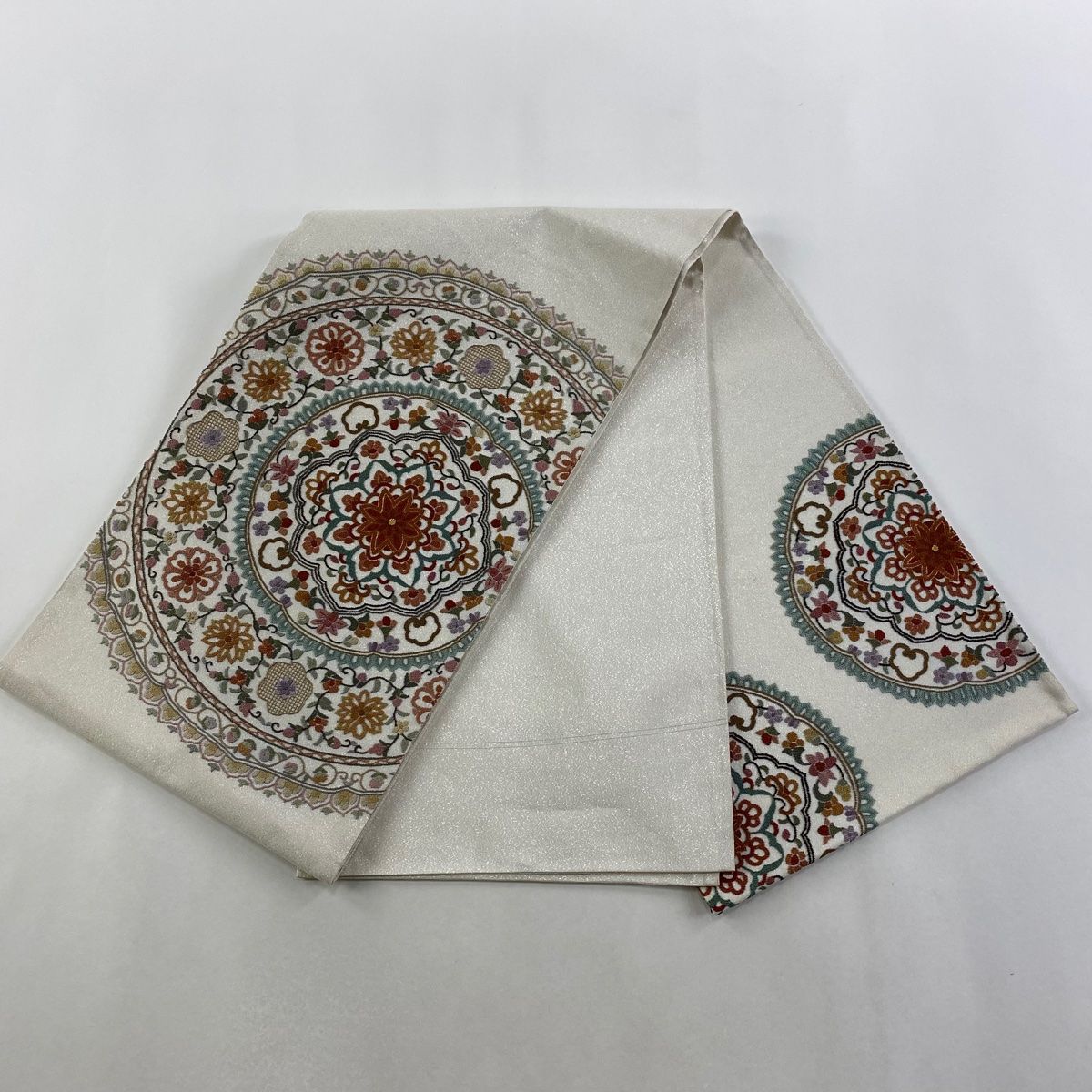 袋帯 華文 草花 相良刺繍 金糸 灰白 お太鼓柄 正絹 GLOBALQUALITYIMPORTS_COM