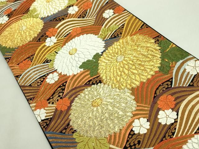 平和屋着物 上 西陣 河合美術織物謹製 六通柄袋帯 唐織 立波菊花文 黒地 金糸 DZAA8803kh5 GLOBALQUALITYIMPORTS_COM