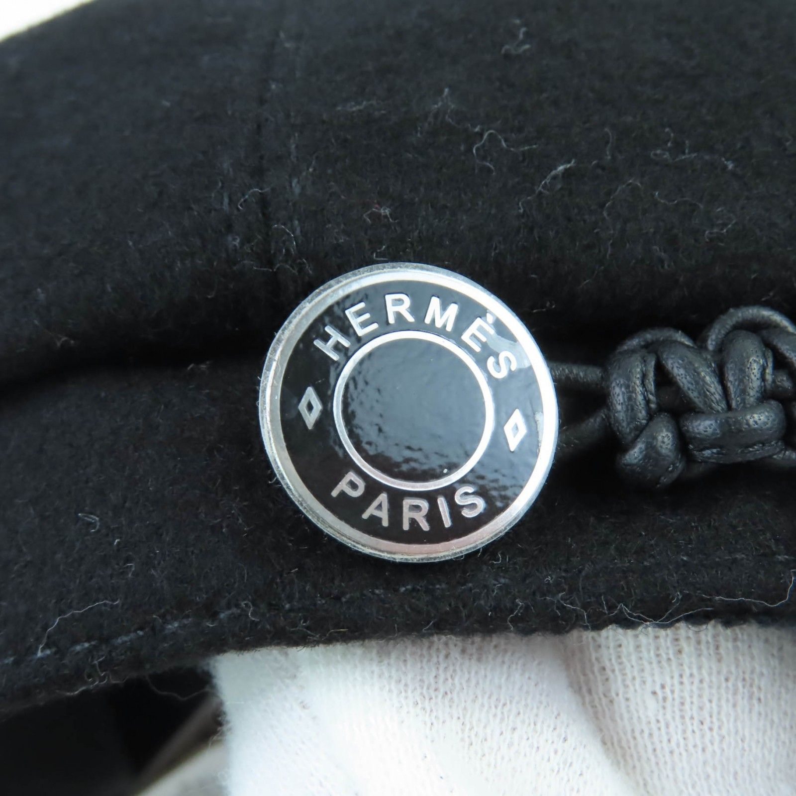HERMES エルメス ドーヴィル カシミヤ100% セリエ金具付 レザー使い キャスケット ブラック 58 保存袋付き フランス製 レディース GLOBALQUALITYIMPORTS_COM