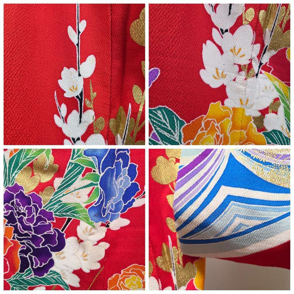 C 着物くつろぎ 作家物 レトロ 豪華 牡丹の花模様 金彩 縮緬 赤 正絹 引き摺り 振袖 着物の検索結果