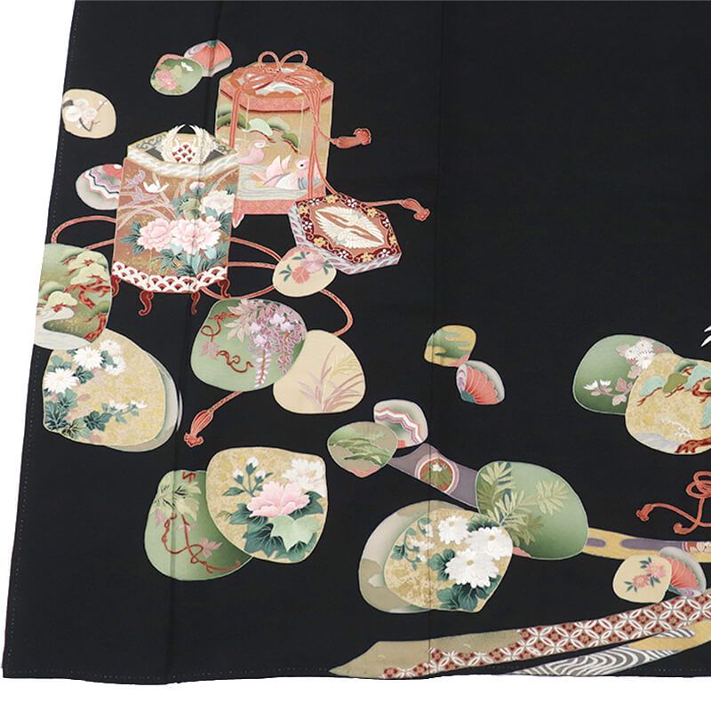 黒留袖 黒 朱 ひわ 緑 桜色 白 鶴 花 波 五つ紋マルニ梅鉢 京友禅 TT34