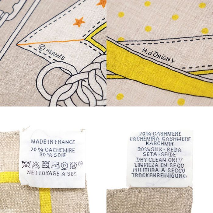 HERMES エルメス カレジェアン140 スカーフ LA PROMENADE DU MATIN 朝の散歩 馬具モチーフ カシミヤ × シルク メンズ レディース ユニセックス ベージュ イエロー フランス製 アンリ ドリニー GLOBALQUALITYIMPORTS_COM