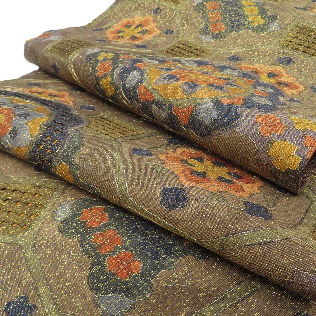袋帯 正絹 フォーマル 六通 汕頭刺繍 スワトウ 中国刺繍 花模様 金通し 茶系色 多色 金 きもの北條 A1286-15 GLOBALQUALITYIMPORTS_COM