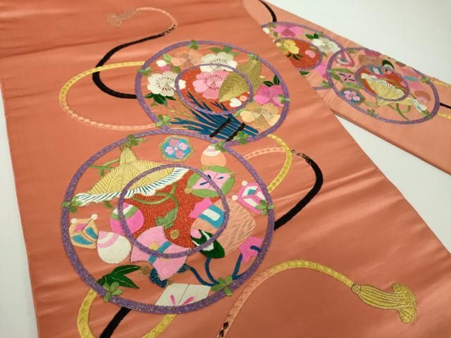 平和屋着物 アンティーク 大正ロマン 九寸名古屋帯 駒刺繍 総刺繍 鏡裏花文 宝尽くし 金糸 正絹 DAAY1189psの検索結果