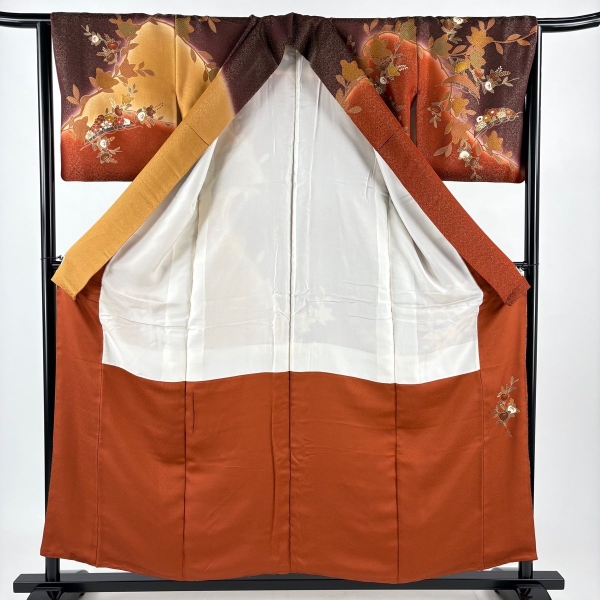 付下げ 身丈159cm 裄丈63.5cm S 袷 草花 雪芝 紬地 焦茶色 正絹 秀品