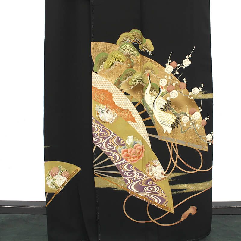 黒留袖 販売 単品 礼装 着物 和装 フォーマル 正絹 黒 丸に三つ柏 扇文 鶴 身丈166cm 裄丈65.5cm 結婚式 母親 M Lサイズ相当 リサイクル着物 リユース着物 着物 GLOBALQUALITYIMPORTS_COM