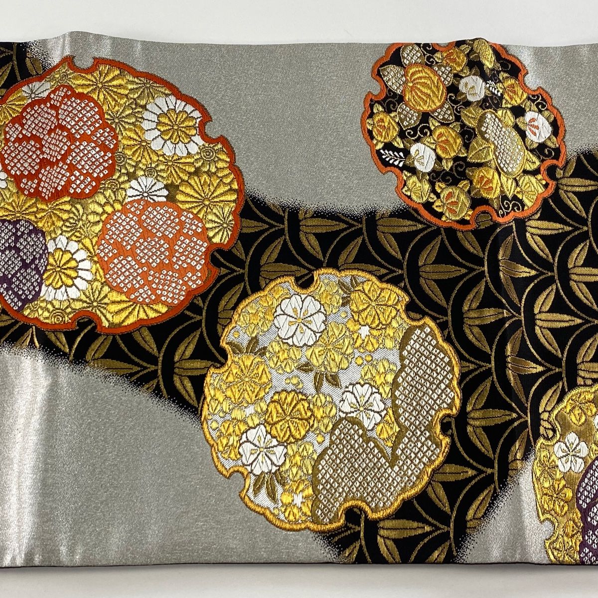 袋帯 秀品 雪輪 草花 金糸 箔 銀色 六通 正絹の検索結果