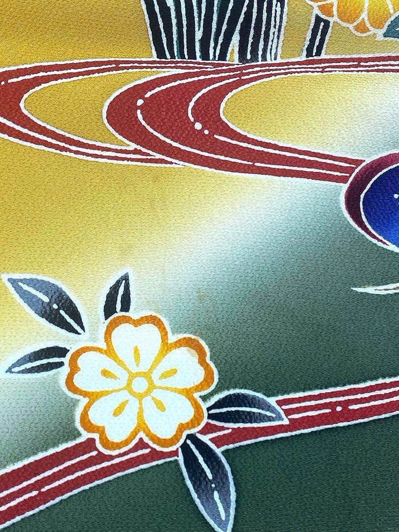 振袖 裄69.5 身丈165 袖103 作家物 正絹 袷 山吹色に鮮やかな花々 め29S01 k2529